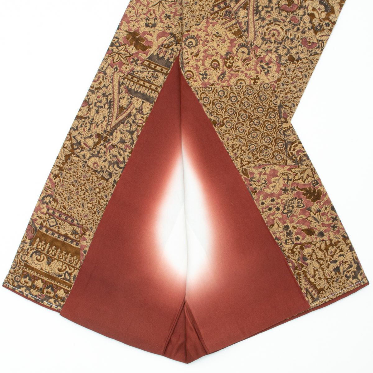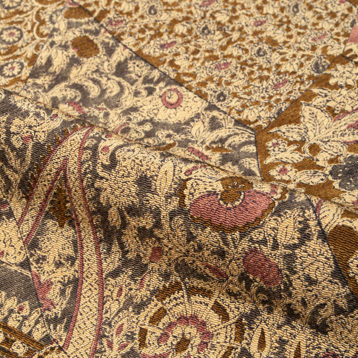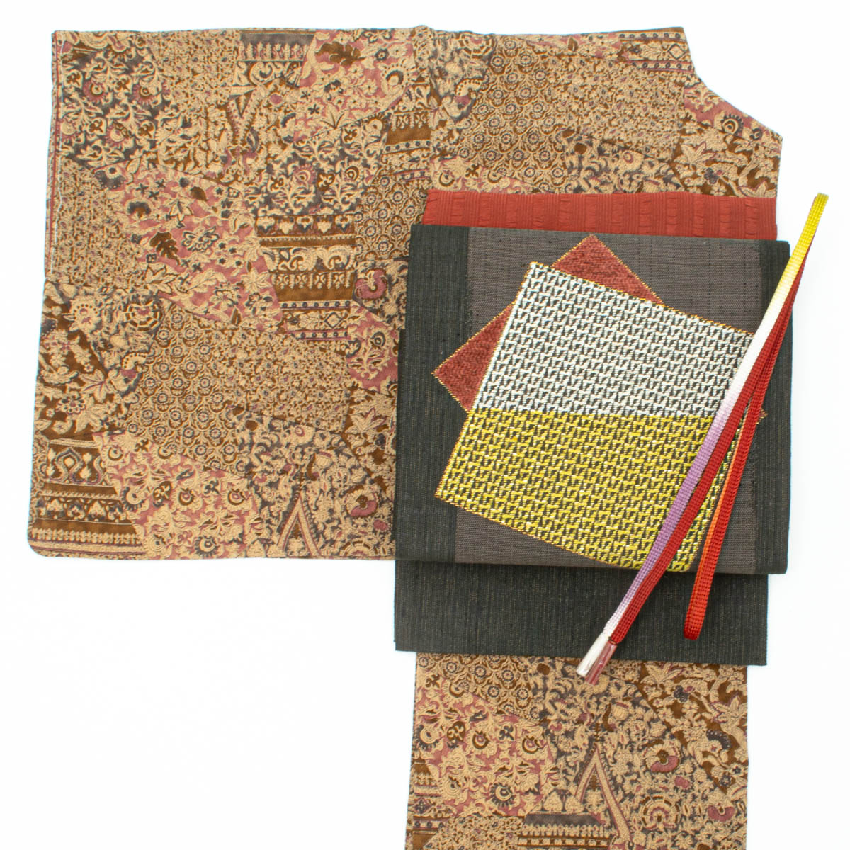 更紗柄を裂取りで表現し、にぶい灰みの黄色と赤紫色を重ねた配色が、落ち着きの中に華やぎを添えます。