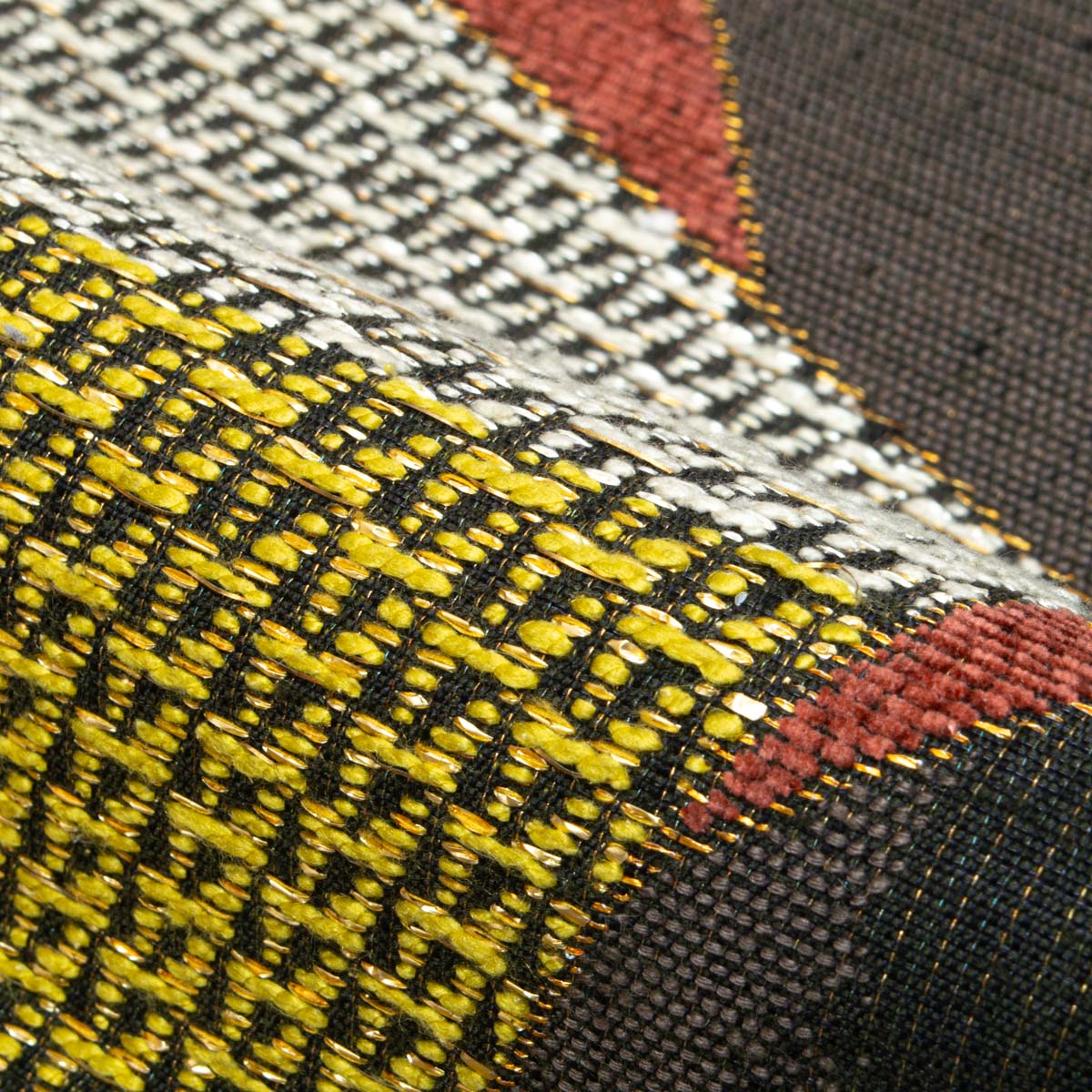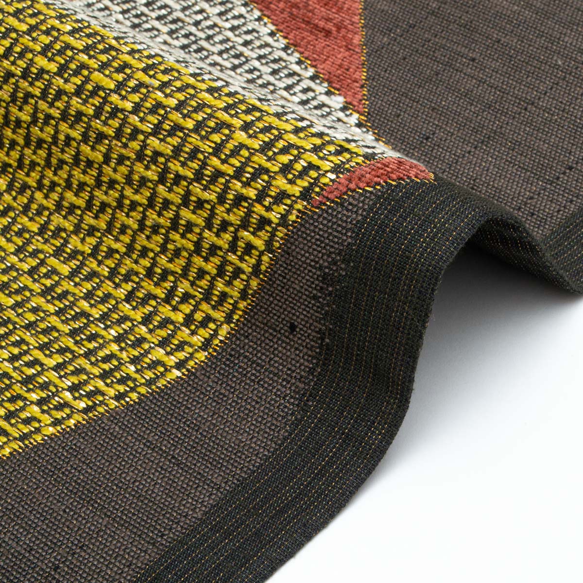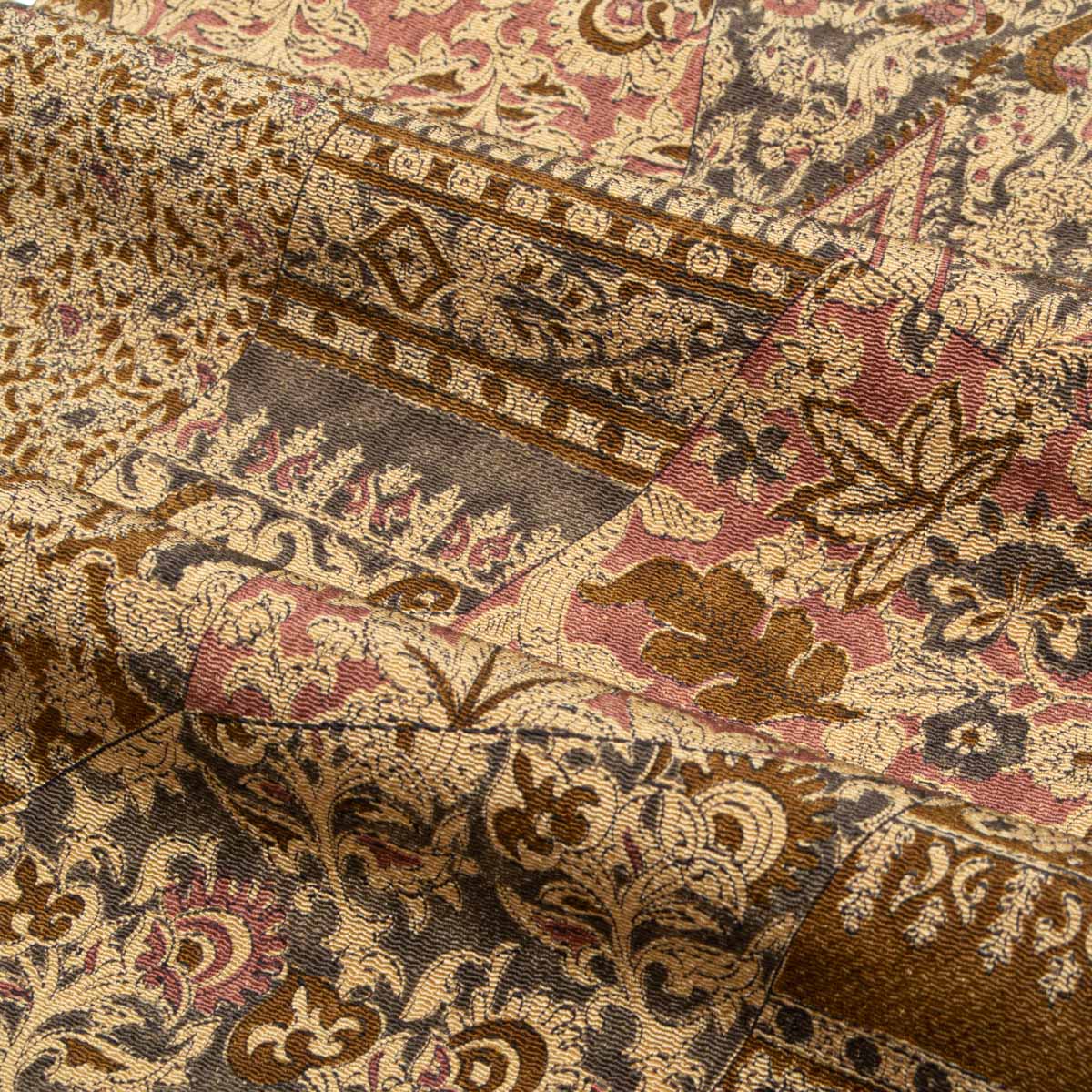 更紗柄を裂取りで表現し、にぶい灰みの黄色と赤紫色を重ねた配色が、落ち着きの中に華やぎを添えます。