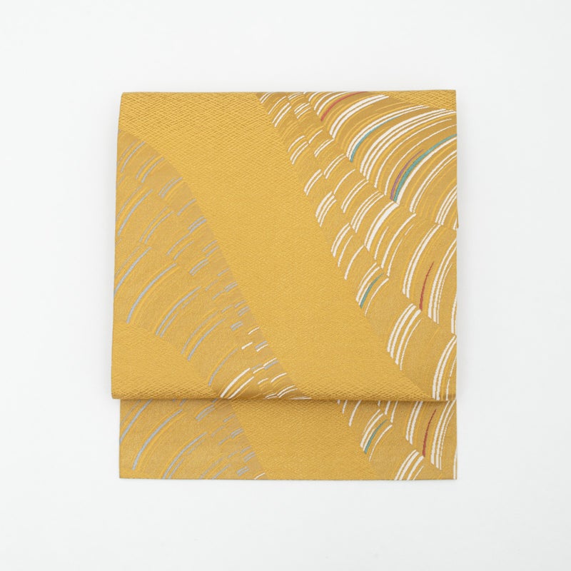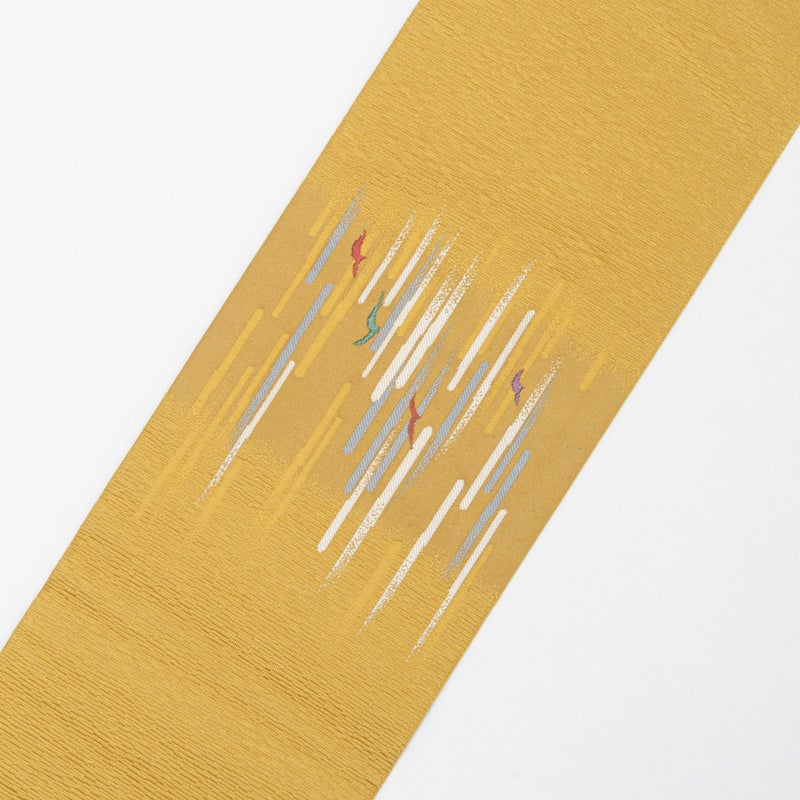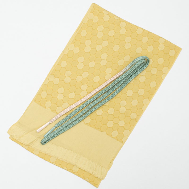 合わせた名古屋帯は、幾何学柄をあしらった明るい黄色が印象的な意匠です。