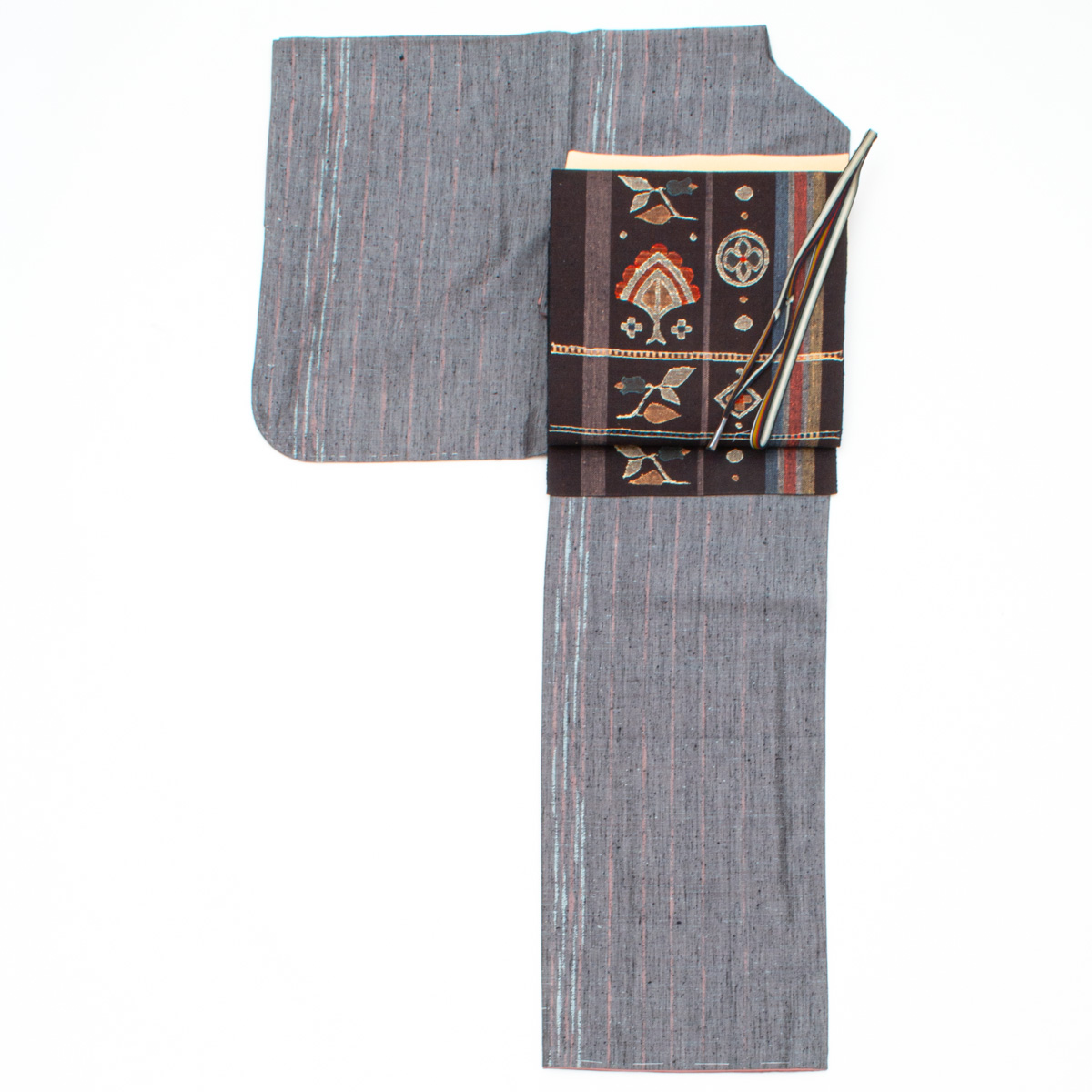 ■コメント紬 絣縞 グレー ピンク 灰青色と名古屋帯 ボタニカル調 縞 焦げ茶色 マルチカラー 八寸のコーディネートです。