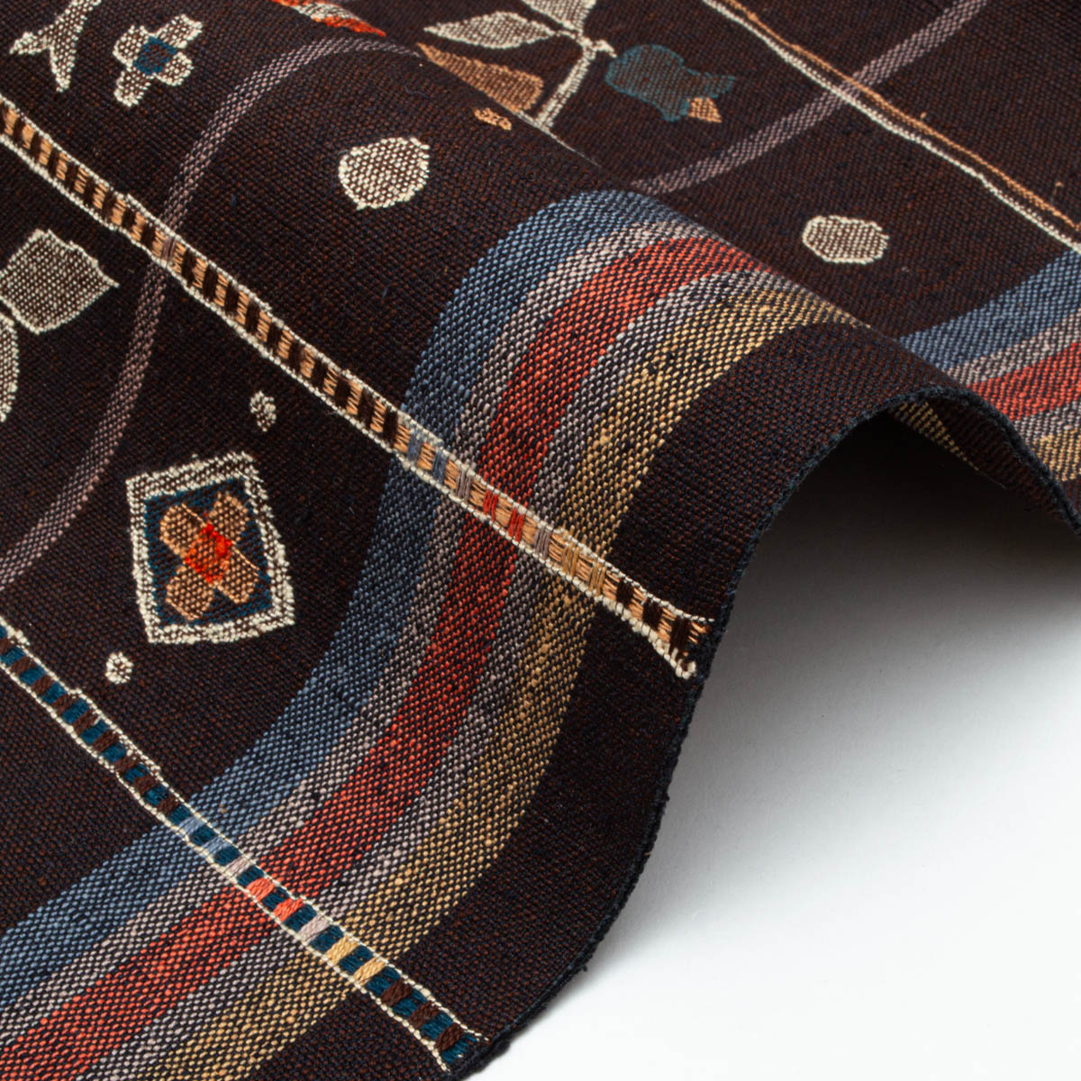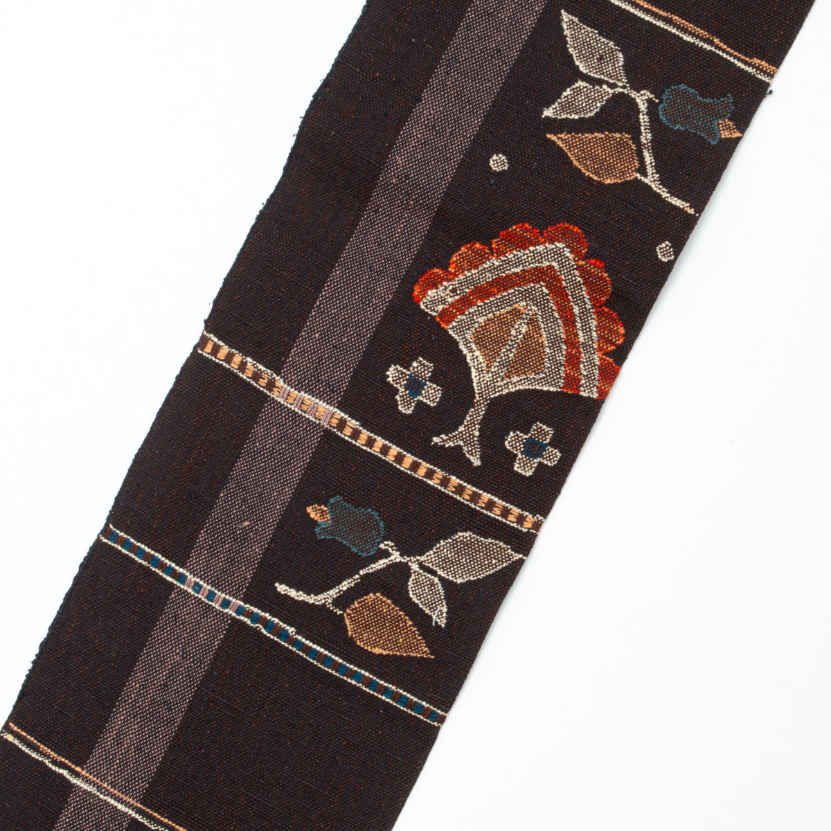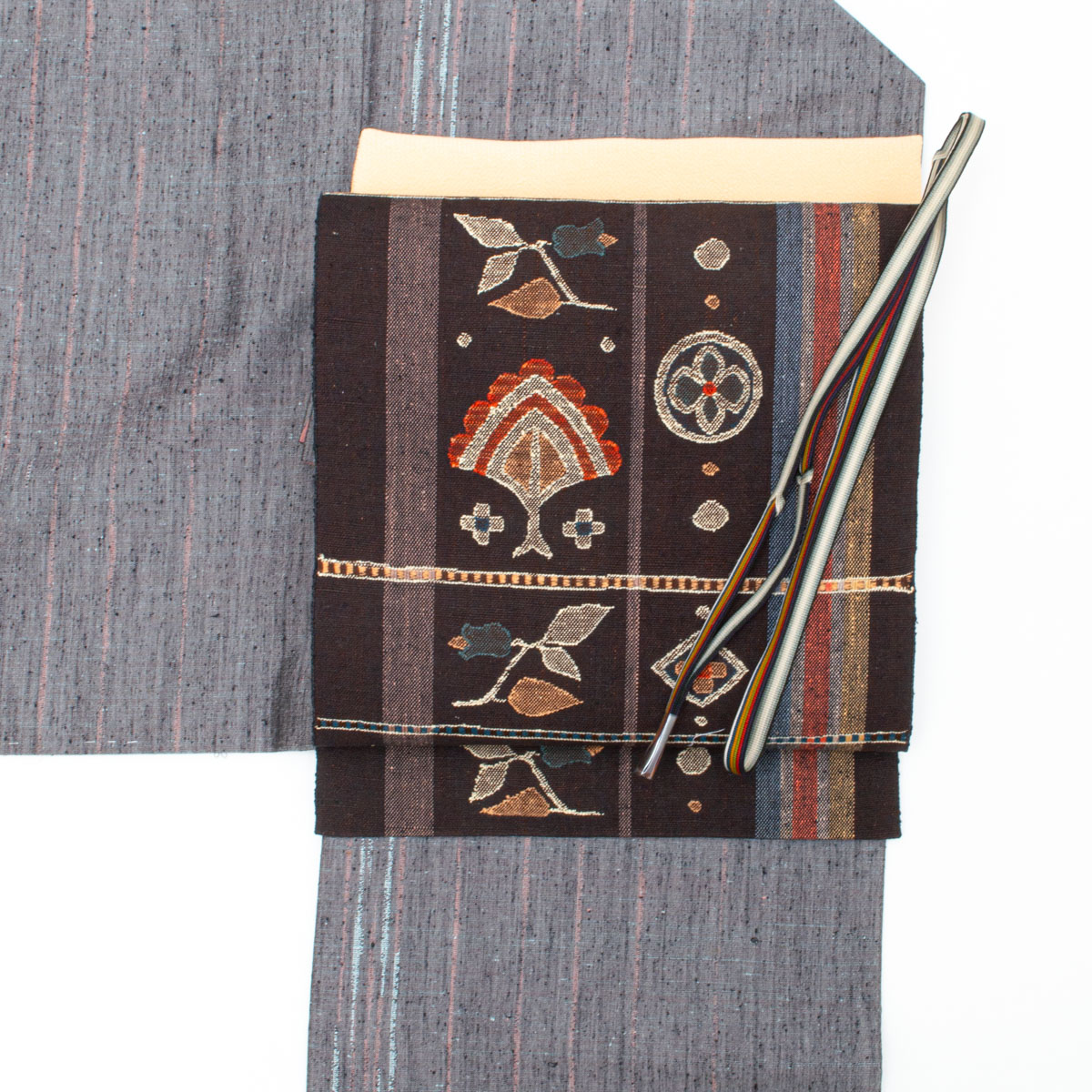 合わせた名古屋帯は、ボタニカル調の意匠に縞を重ねたデザインです。