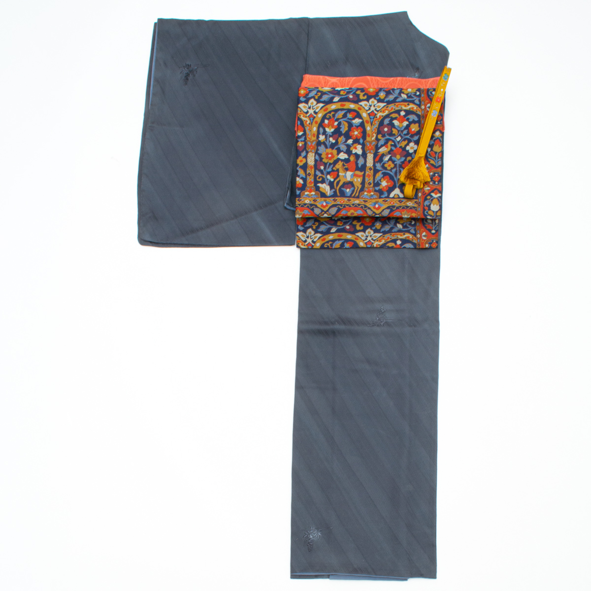 織とグラデーションカラーの斜め縞に刺繍の飛び柄をあしらった、表情豊かな小紋です。