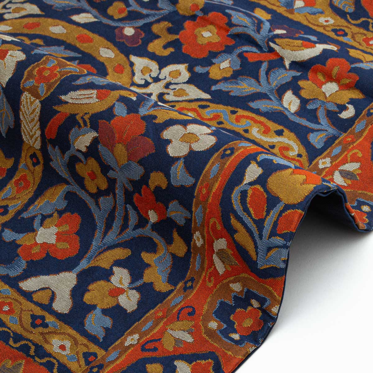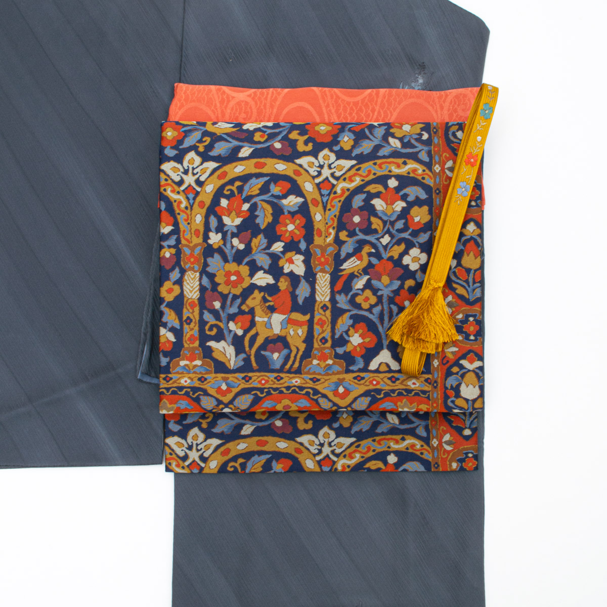 ■コメント小紋 斜め縞 刺繍飛び柄 暗い青色と名古屋帯 ボタニカル調 人と馬 青色 マルチカラー 九寸のコーディネートです。