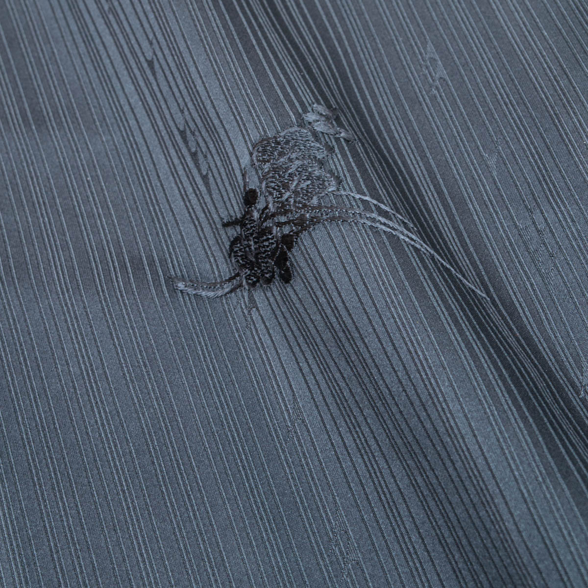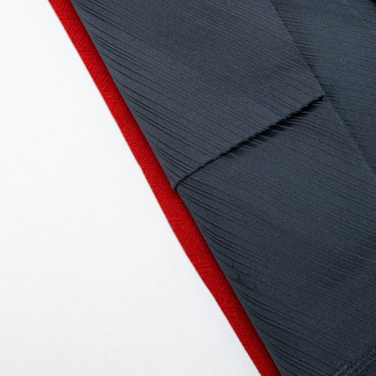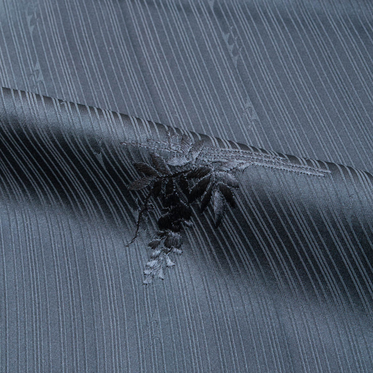 暗い青色の地が落ち着いた印象を与え、さりげなく施された刺繍が装いに上品な華やぎを添えます。
