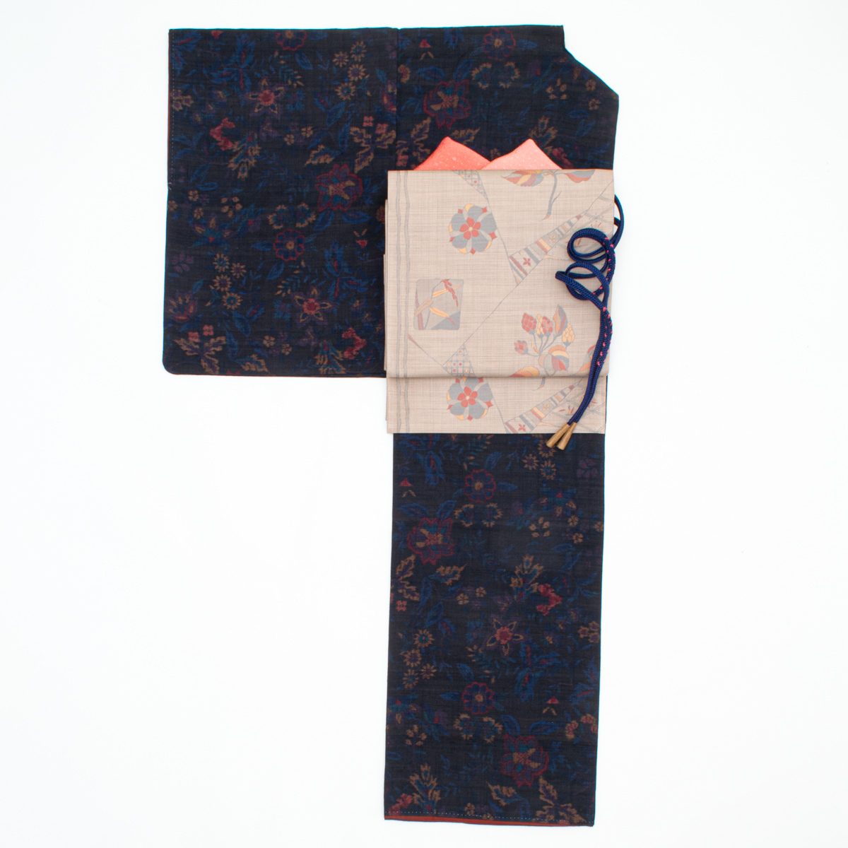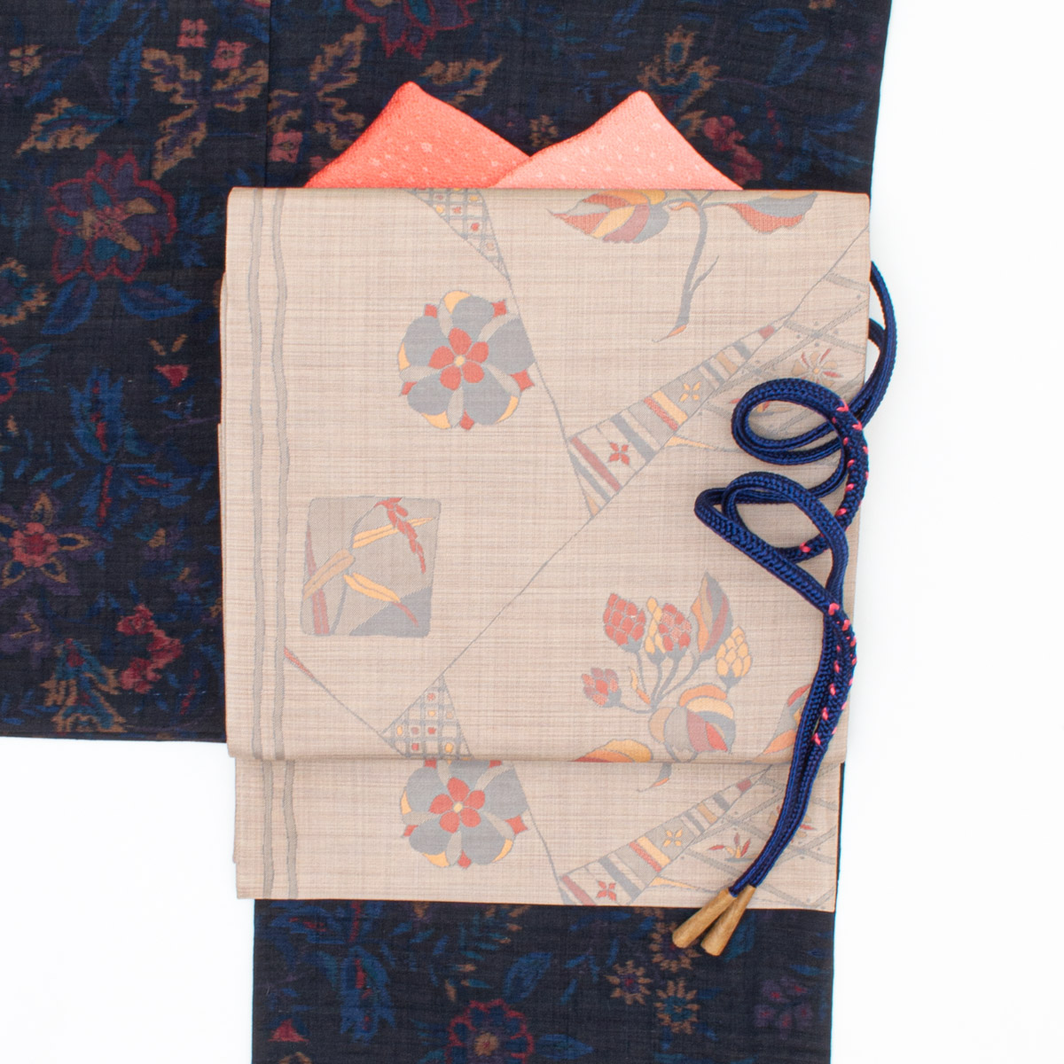 ■コメント紬 唐花文 紺色 マルチカラーと洒落袋帯 植物文と幾何学柄 灰梅色のコーディネートです。