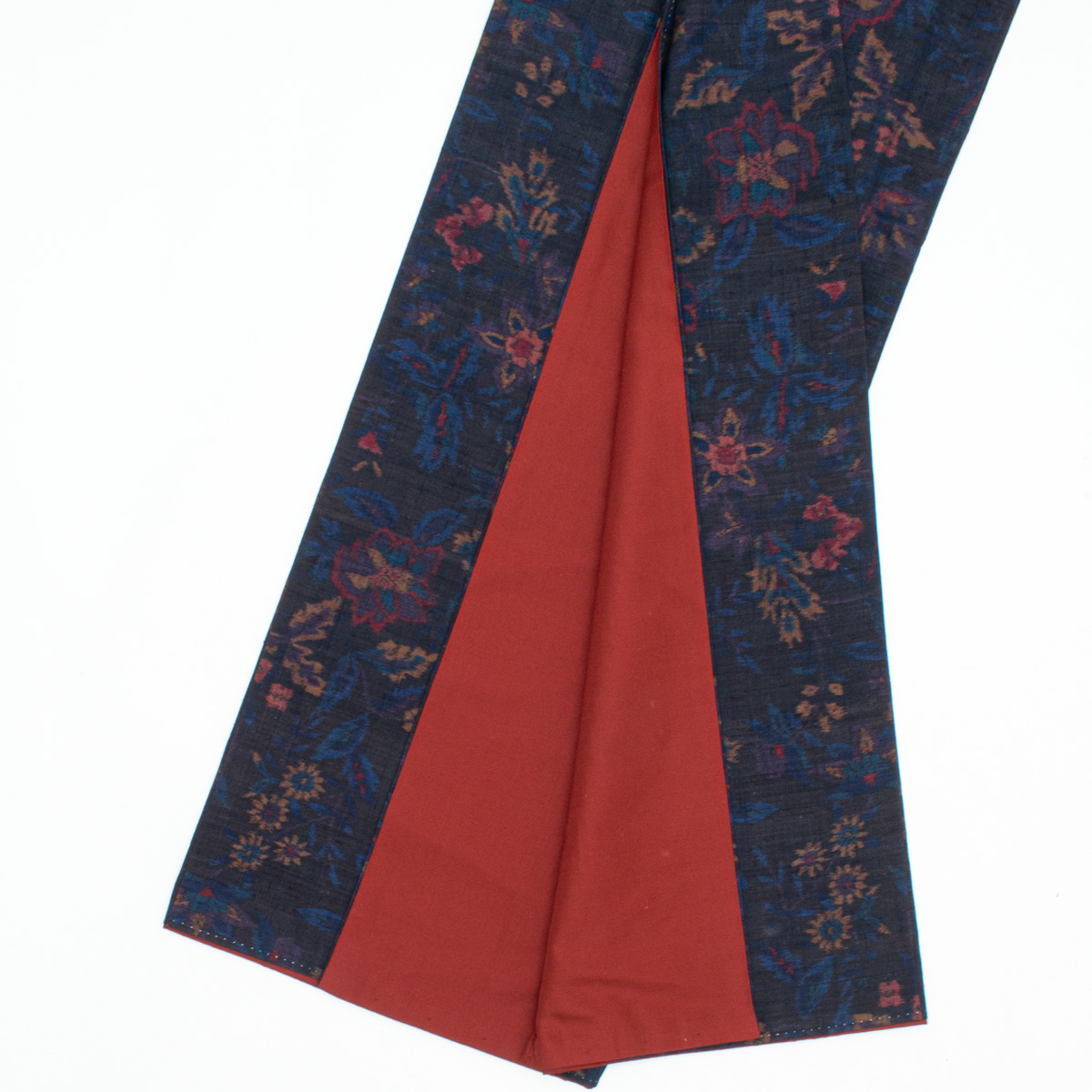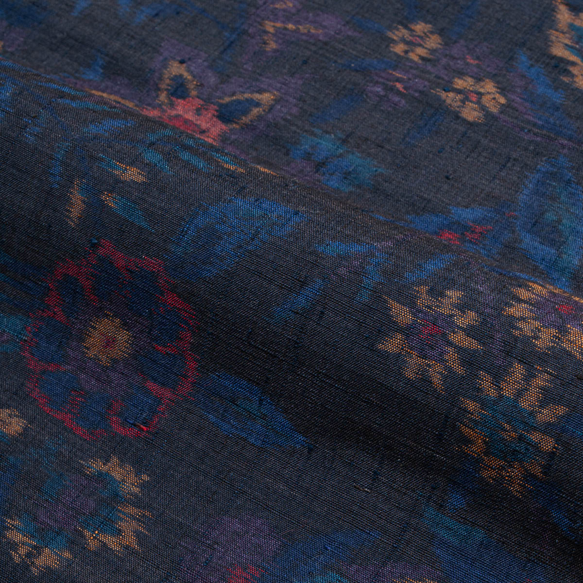 紺色の地にマルチカラーの意匠が映え、落ち着きの中にさりげない華やぎを添えます。
