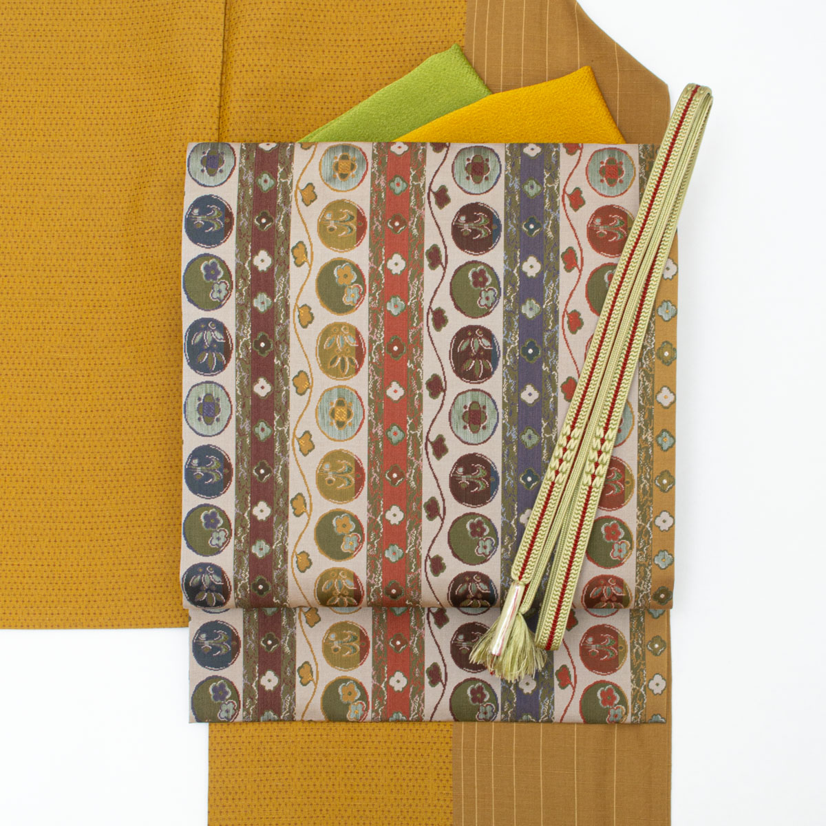 ■コメント紬 モダン縞 モカ 渋い黄褐色と名古屋帯 縞と小花 笹 灰みの白色 マルチカラー 九寸のコーディネートです。