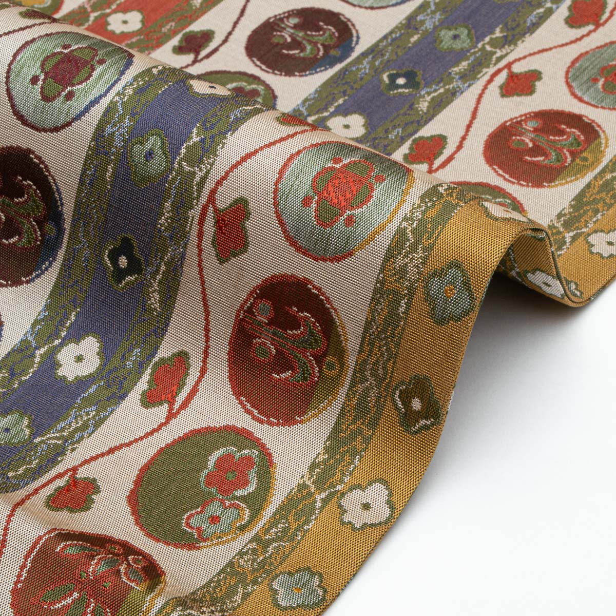 合わせた名古屋帯は、縞に古典柄の小花や笹などをデザイン化した意匠をあしらった面白みのある帯です。
