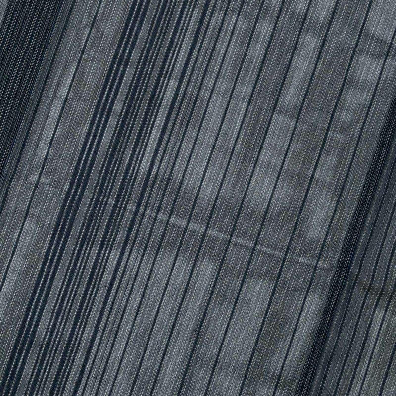 ■コメント夏着物 お召 十字絣文 縞 紺 白色と半幅帯 ポリエステル よろけ縞✕ボーダー 黒マルチカラー✕黒赤色のコーディネートです。
