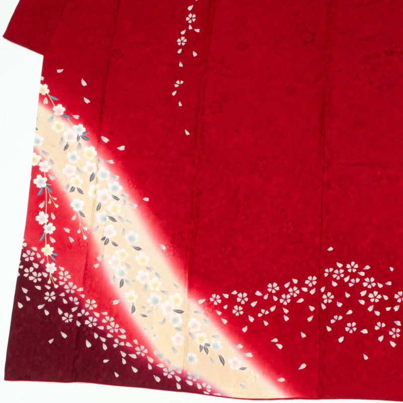 華やかな赤地に友禅の桜が咲き誇るお振袖です。