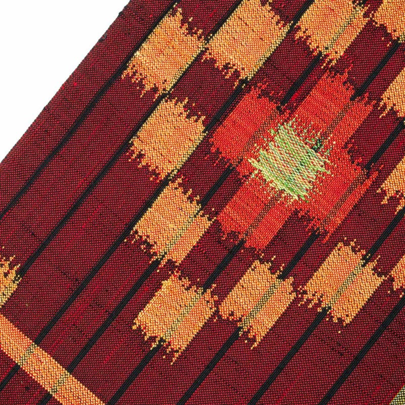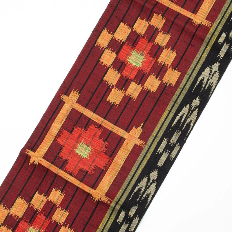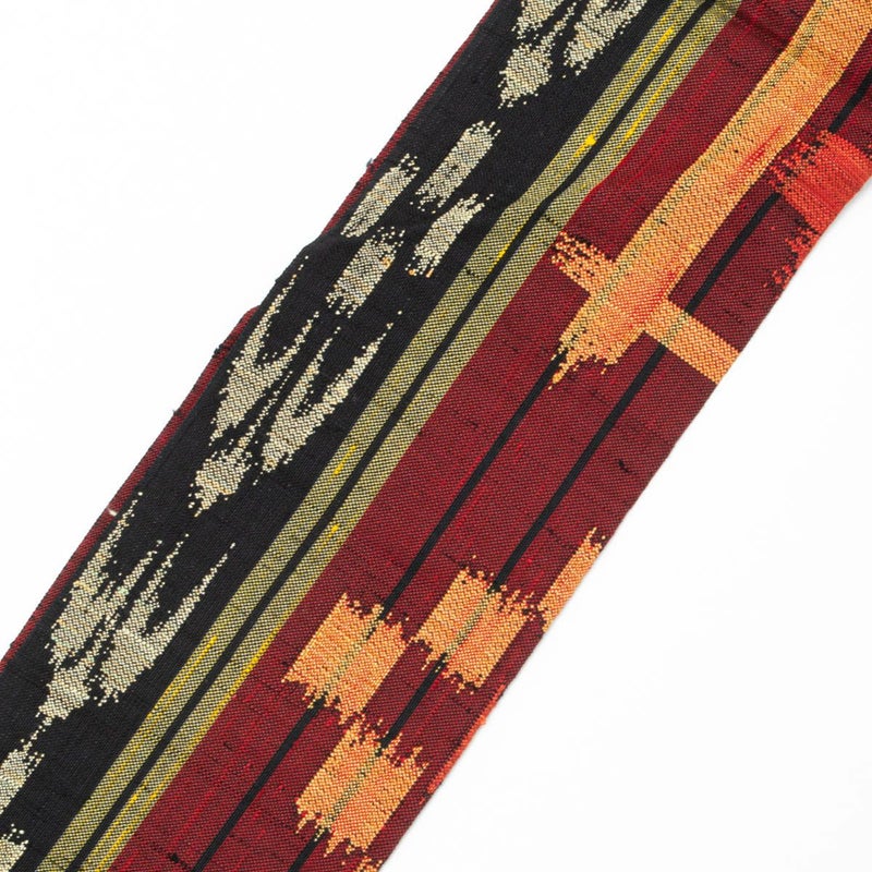 名古屋帯 真綿織 絣柄 赤 黒 白 緑色 八寸 正絹のお品です。