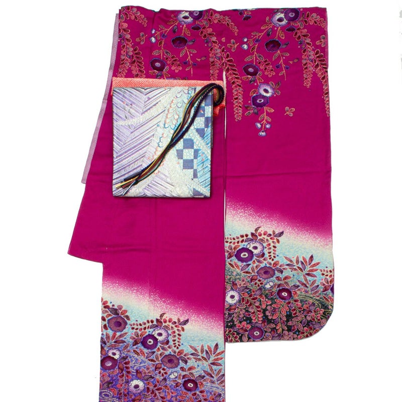 振り袖 辻が花 裾暈し上げ 赤紫色と袋帯 膨れ織 藤柄 幾何学 緑 紫色 マルチカラーのコーディネートです。