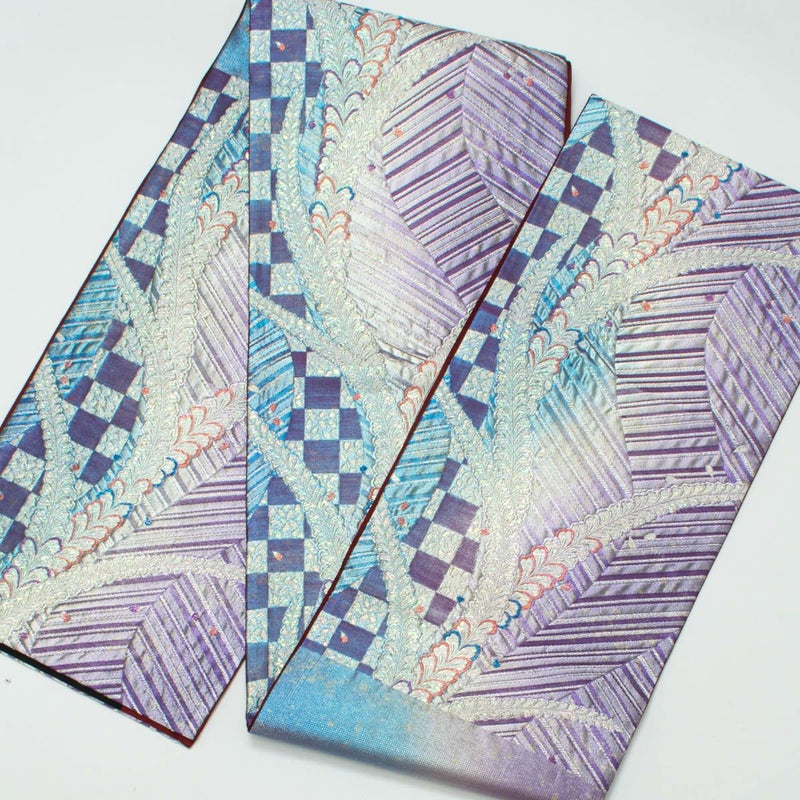 合わせた袋帯は、膨れ織で立体感のある藤柄と幾何学模様を組み合わせた個性派デザイン。