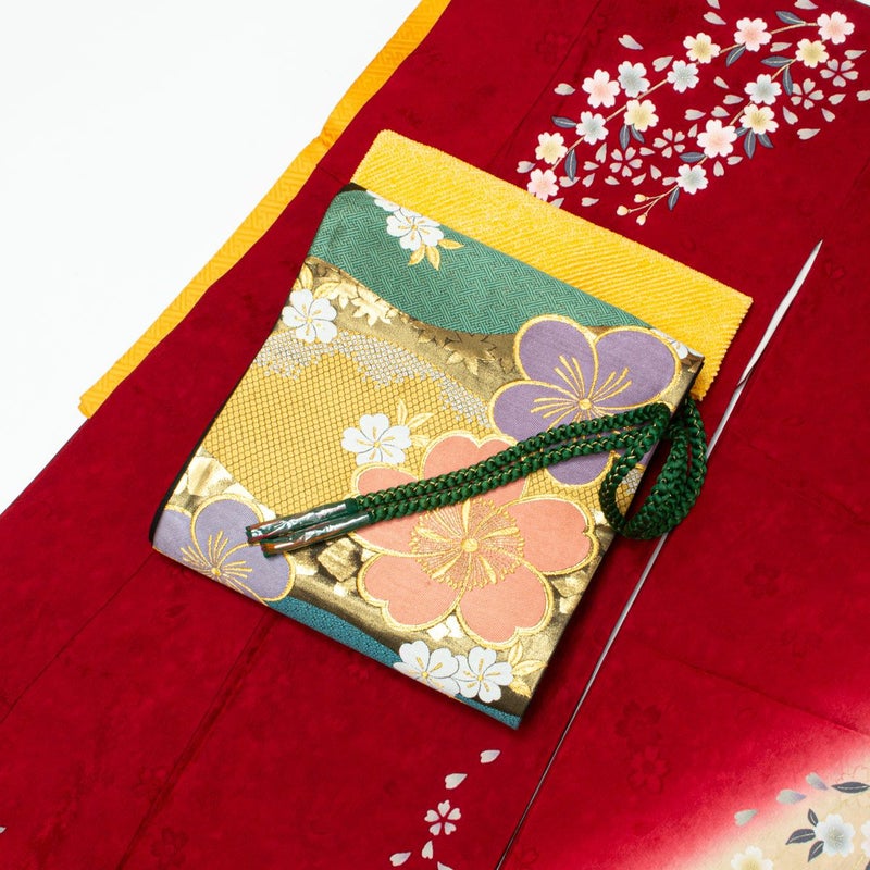 振り袖 友禅 桜 暈し 赤色と袋帯 桜文 緑 黄 桜色のコーディネートです。