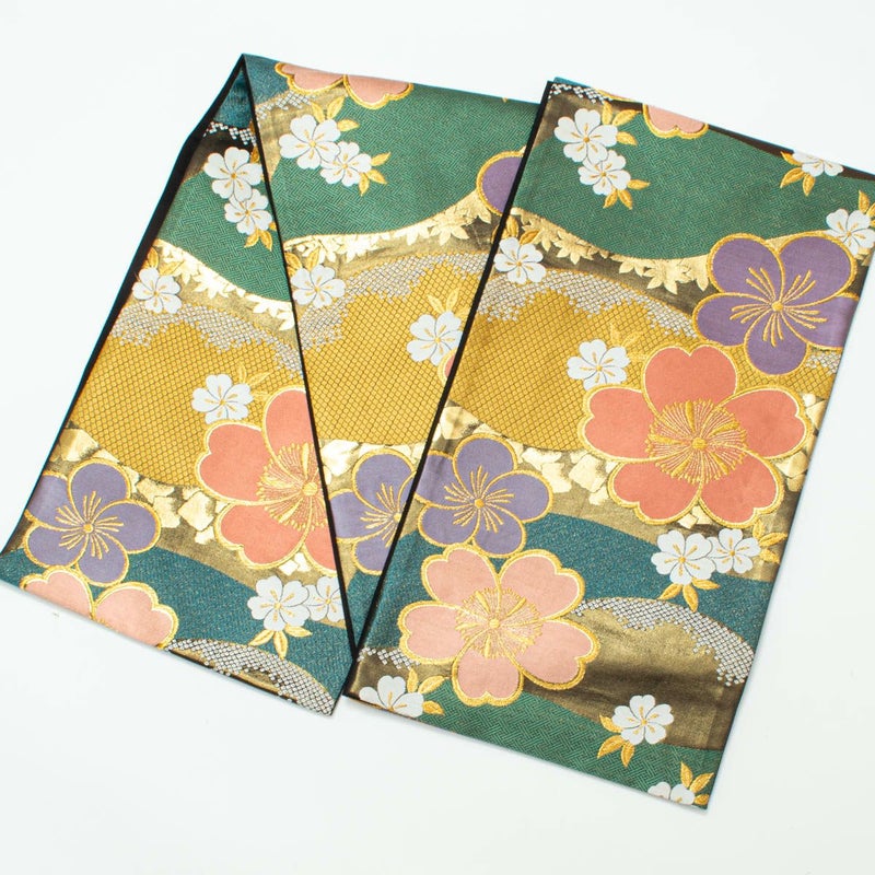 合わせた袋帯は、柔らかな緑・黄・桜色を基調にし桜文の彩りが装いにやわらかな華やぎを添えます。