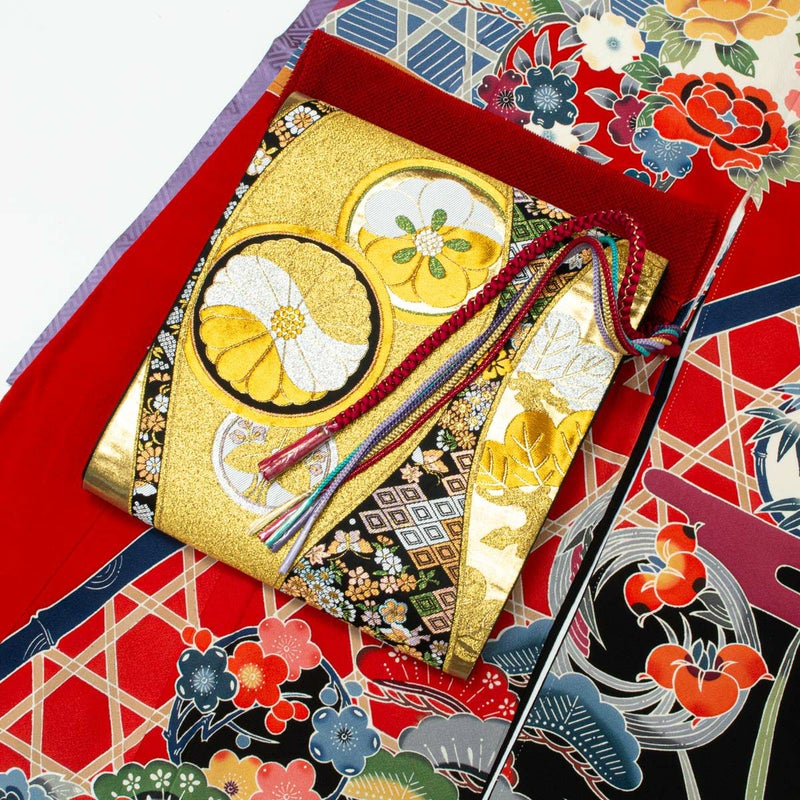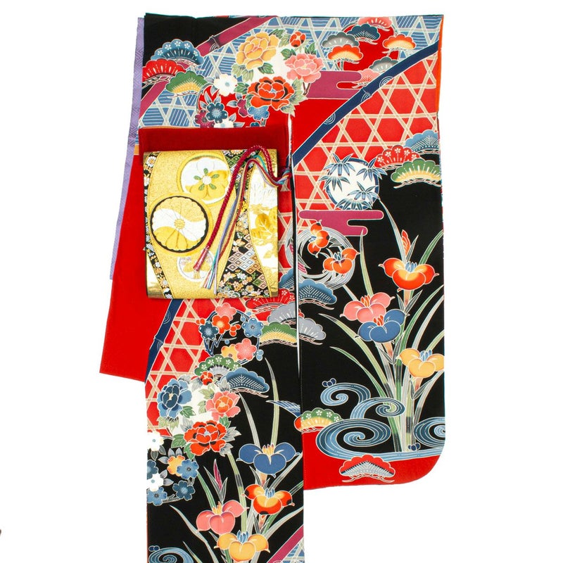 振り袖 友禅 四季の花丸文と御所解文様 赤色 マルチカラーと袋帯 立涌に花紋 黒 金色 マルチカラーのコーディネートです。