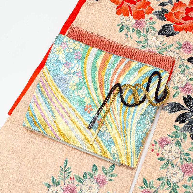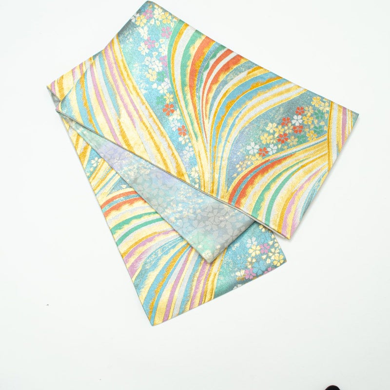 合わせた袋帯は、水色に流れるような線と桜があしらわれたデザインで、多彩な色使いが振袖と美しく調和。