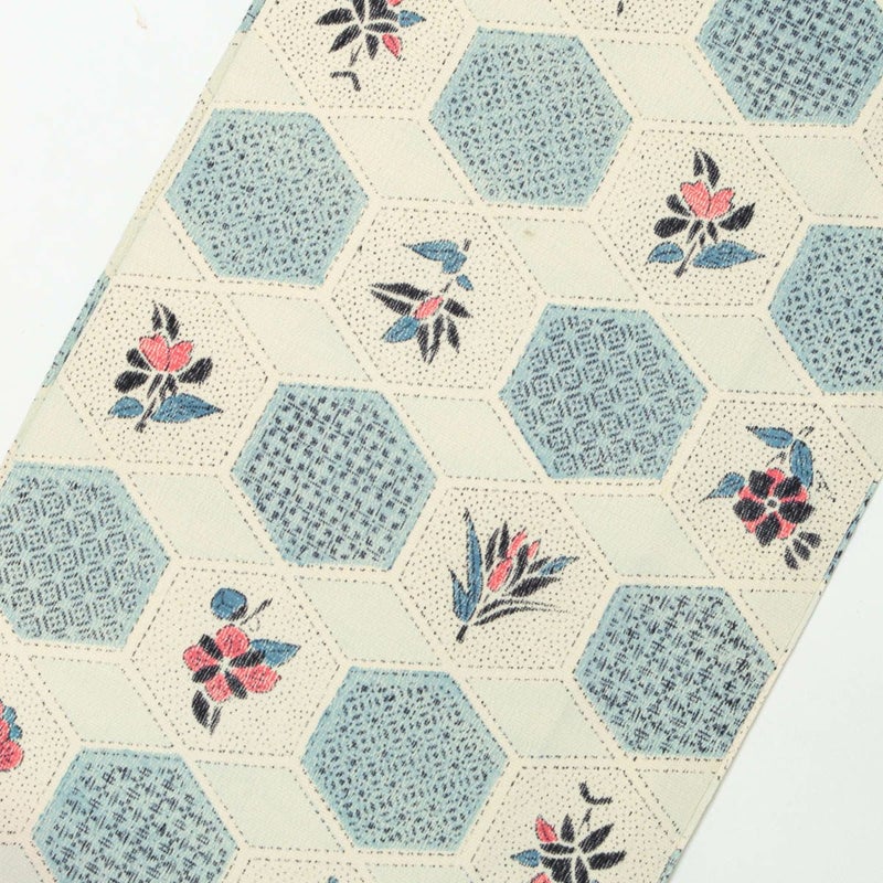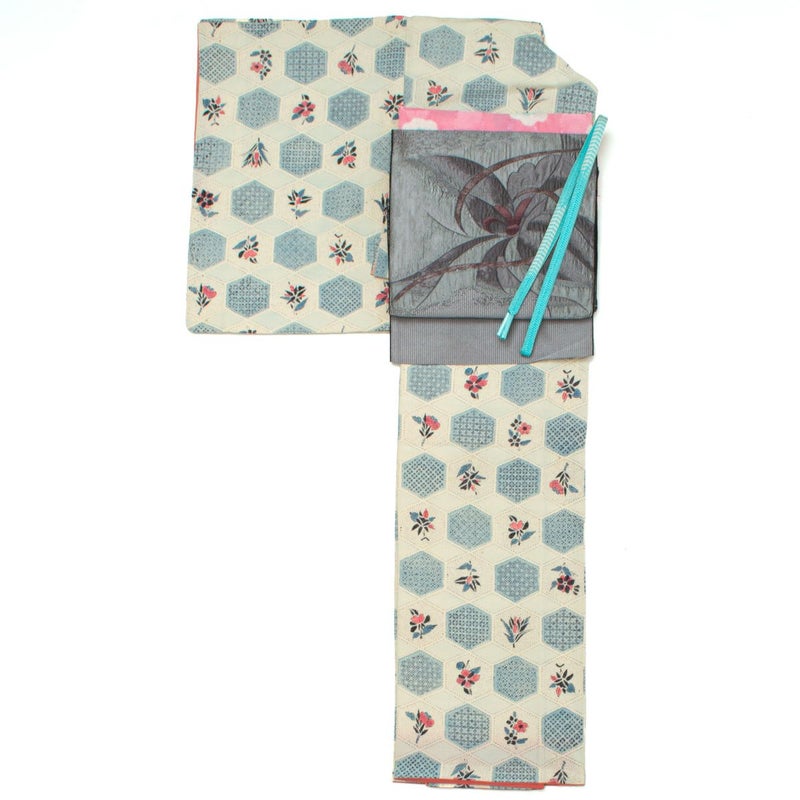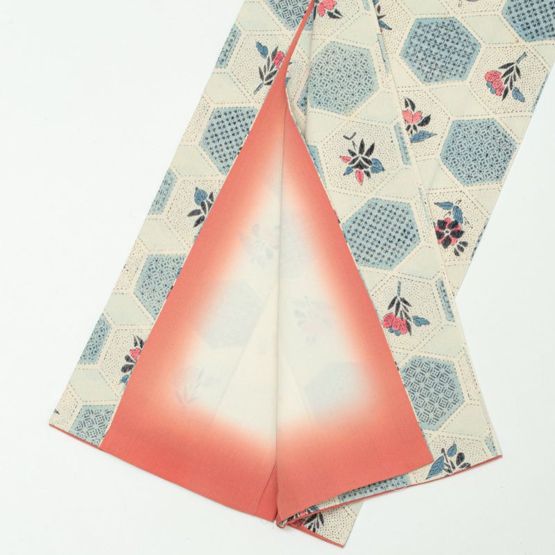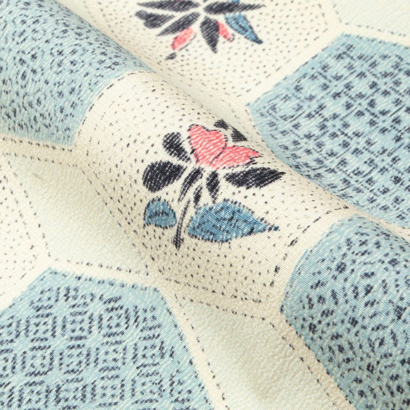 【かつてコーデだった着物たち!】小紋 縮緬 亀甲文に花柄 赤 灰みの水色 オフホワイト 正絹 着物 リサイクル 23