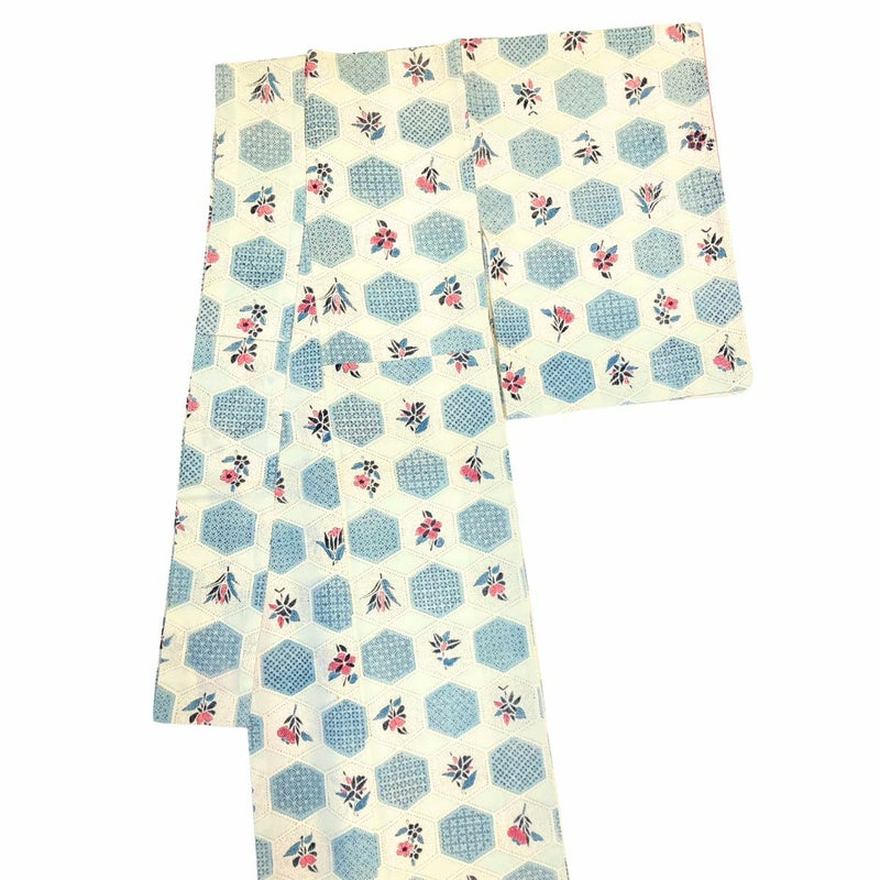 小紋 縮緬 亀甲文に花柄 赤 灰みの水色 オフホワイト 正絹 着物 リサイクルのお品です。
